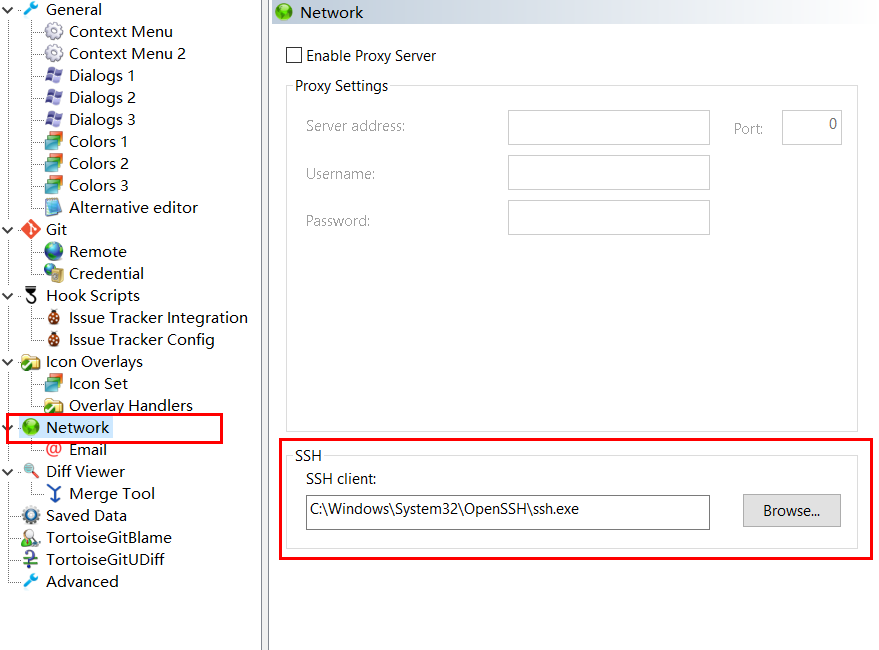 在 TortoiseGit 设置中,选择 Network 选项,将 SSH client 设置为 tortoisegitplink.exe。